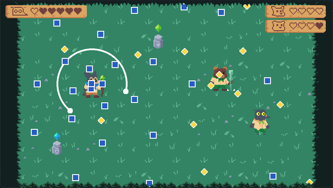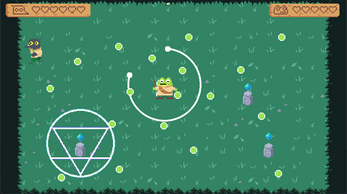 Spellcasting Camp is a bullet hell game where you attack your opponents by looping around them to form circles while you avoid their attacks.